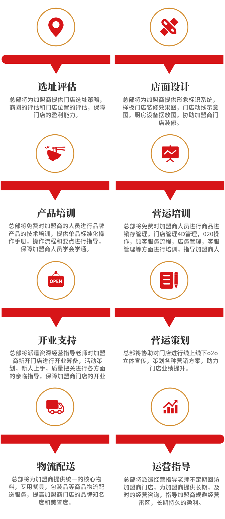 总部为加盟商提供长期,及时的经营咨询,指导加盟商规避经营雷区,长期持久的盈利。合作终身制,降低投入和风险,共创百年老字号